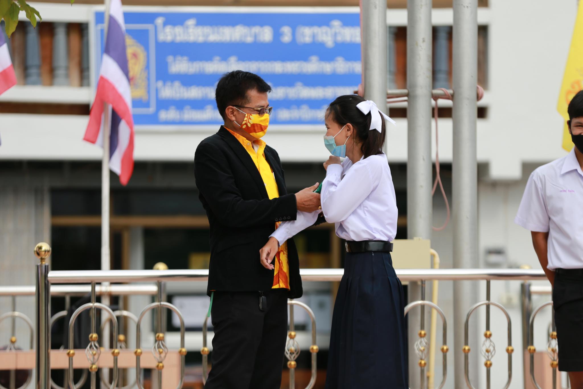 ดร.วรวุฒิ แสงนาก ผู้อำนวยการโรงเรียนเทศบาล 3 (ชาญวิทยา) มอบปลอดแขนให้แก่สภานักเรียนชุดใหม่ พร้อมกล่าวคำแสดงความยินดี